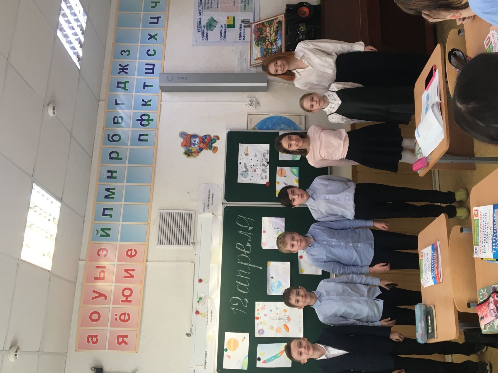 В 4б классе ко Дню космонавтики прошел конкурс рисунков. Перед этим обучающиеся познакомились с тем, как готовят космонавтов, как устроен комплекс «Союз», вспомнили о том, что увидели в Планетарии. А, уже после этого воплотили свои впечатления на бумаге. В 1А классе ребятами был просмотрен фильм «Звезда по имени Гагарин»