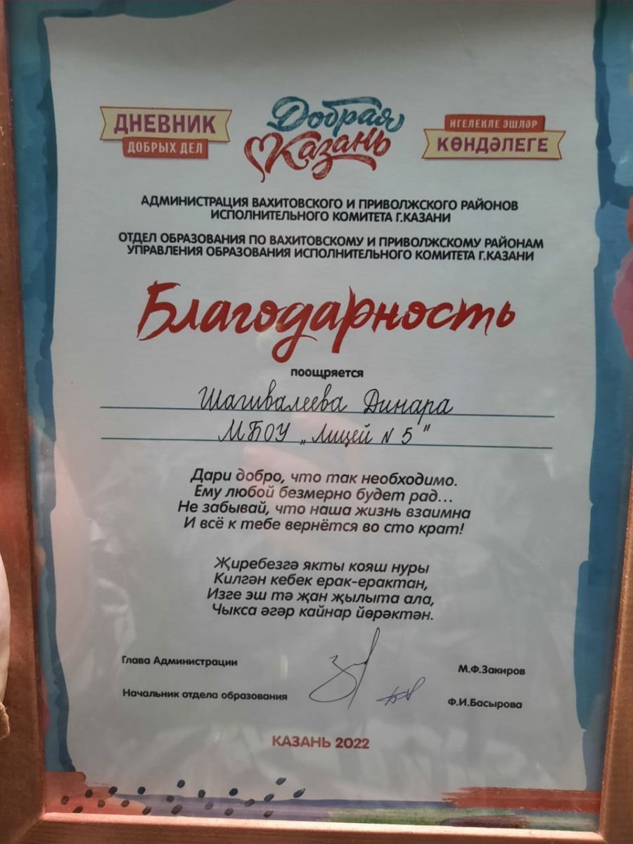 21 мая Динара была приглашена на вручение благодарственного письма за подписью главы Администрации Вахитовского и Приволжского районов г.Казани.