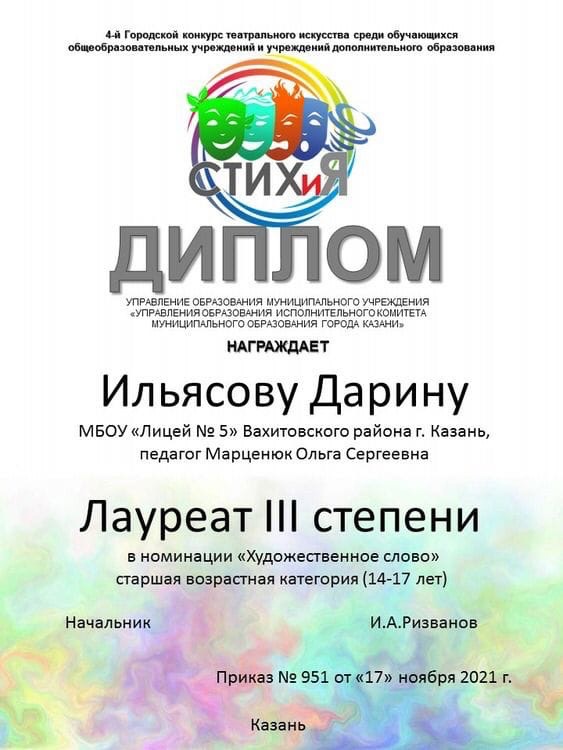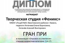 Учащиеся нашего лицея приняли участие в этом конкурсе: Ильясова Дарина (9А класс) в номинации «Художественное слово» стала лауреатом 3 степени (педагог Марценюк О.С.), творческая студия «Феникс»(9В класс) в номинации «Отрывок из спектакля» получили гран-при (педагоги Ингачёва Е.Б., Ингачёв А.В.)
