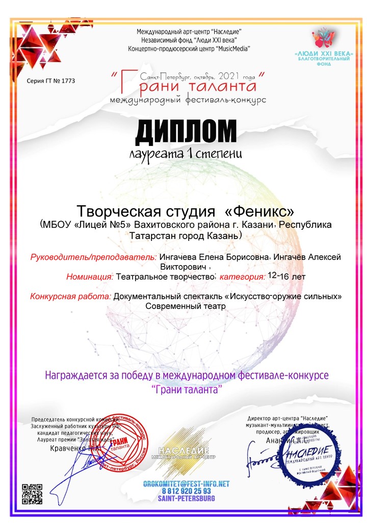 Творческая студия «Феникс» стала победителем Международного фестиваля-конкурса "Грани таланта" (г. Санкт-Петербург) в номинации «Современный театр». На суд жюри был представлен Документальный спектакль «Искусство — оружие сильных!» Жюри по достоинству оценило работу ребят, присудив им звание Лауреат 1 степени.