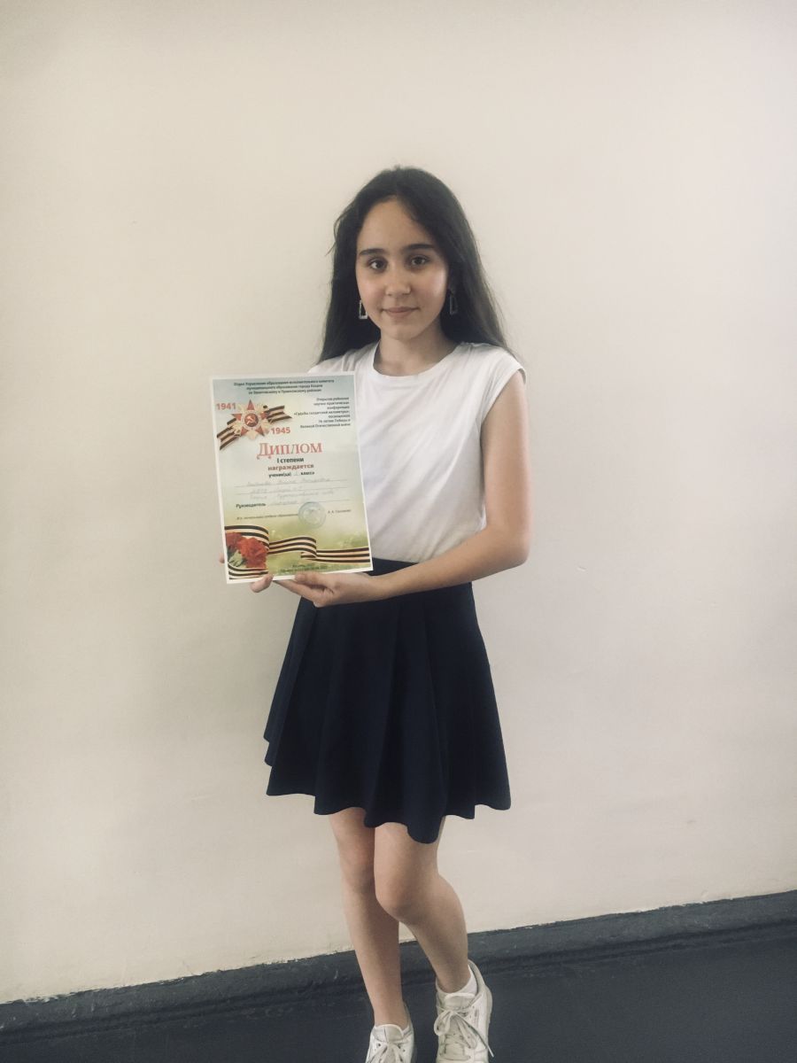 В номинации «Художественное слово (выразительное чтение наизусть прозаических произведений (фрагментов) о Великой Отечественной войне (6-8 классы) Спиридонова Ксения (8б класс) заняла 1 место, Зайниева Ралина (6в класс) - 1 место, Вахитова Вилина (8б класс) - 2 место, Сафронова Елизавета (8б класс) - 3 место ( руководитель - учитель литературы Марценюк О.С.)