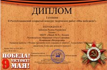 В рамках II Республиканского открытого конкурса творческих работ «Мы победили!» ученицы 6в класса – Трифонова Ариана, Трифонова Алисия и Зайниева Ралина прочитали наизусть прозаические и лирические отрывки. Выступления девочек были трогательные, наполненные искренними чувствами.