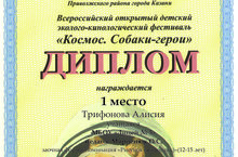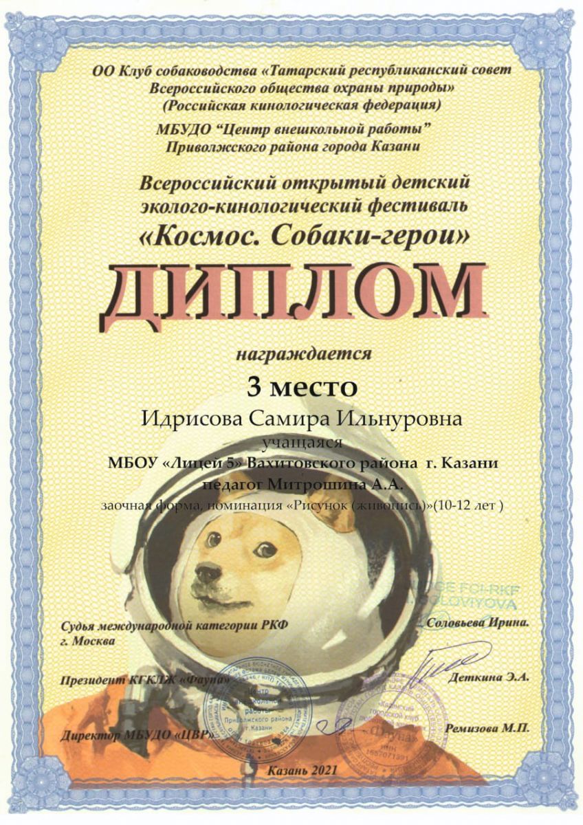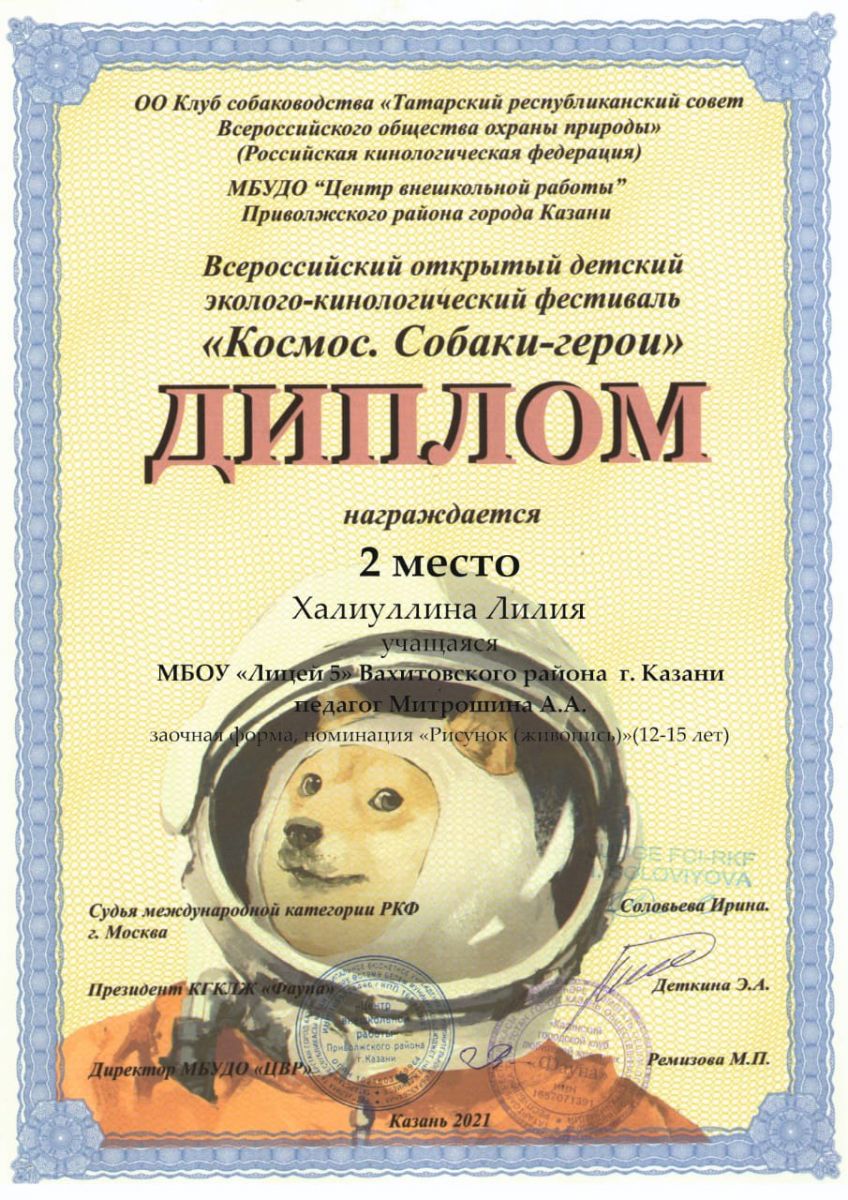 В рамках Всероссийского открытого детского эколого-кинологического фестиваля «Космос. Собаки-герои», организуемого «Татарским республиканским советом Всероссийского общества охраны природы» и МБУДО «Центр внешкольной работы» Приволжского района г. , ученики 5а и 6в классов представили свои творческие работы: Идрисова Самира (номинация «Рисунок», руководитель Митрошина А.А.) - 3 место, Халиуллина Лилия ( номинация «Рисунок», руководитель Митрошина А.А.) - 2 место, Хайруллин Амир ( номинация «Рисунок», руководитель Митрошина А.А.) - грамота за творческий подход, Трифонова Ариана (номинация «Стихи», руководитель Марценюк О.С.) - 1 место, Трифонова Алисия (номинация «Рисунок», руководитель Марценюк О.С.) - 1 место. Поздравляем!