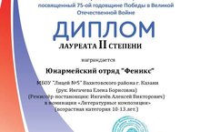 Поздравляем юнармейский отряд «Феникс» лауреатов 2 степени Республиканского конкурса !. В начале ноября вГДДТ им. А. Алиша прошел Республиканский конкурс-фестиваль «Патриоты России!», посвященный 75-ой годовщине Победы в Великой Отечественной войне, на котором юнармейский отряд «Феникс» нашего Лицея представил Литературно-музыкальную композицию «Казань-город трудовой славы!». Жюри высоко оценило выступление ребят, присудив им 2 место.