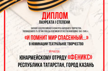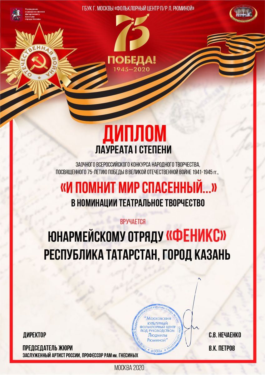 В июле 2020 года, в городе Москва прошёл фестиваль конкурса народного творчества, посвящённого 75-летию победы в Великой Отечественной войне 1941-1945 гг. «И ПОМНИТ МИР СПАСЁННЫЙ...»!, который проводил Театр Людмилы Рюминой. В конкурсе было подано более 5000 заявок, в номинации «Театральное искусство» — около 1500. Именно в этой номинации была представлена Музыкально-литературная композиция «Искусство-оружие сильных!» творческой группы Юнармейского отряда «Феникс». Жюри высоко оценило эту работу и присудило нашему коллективу 1 место! Поздравляем и желаем дальнейших успехов.