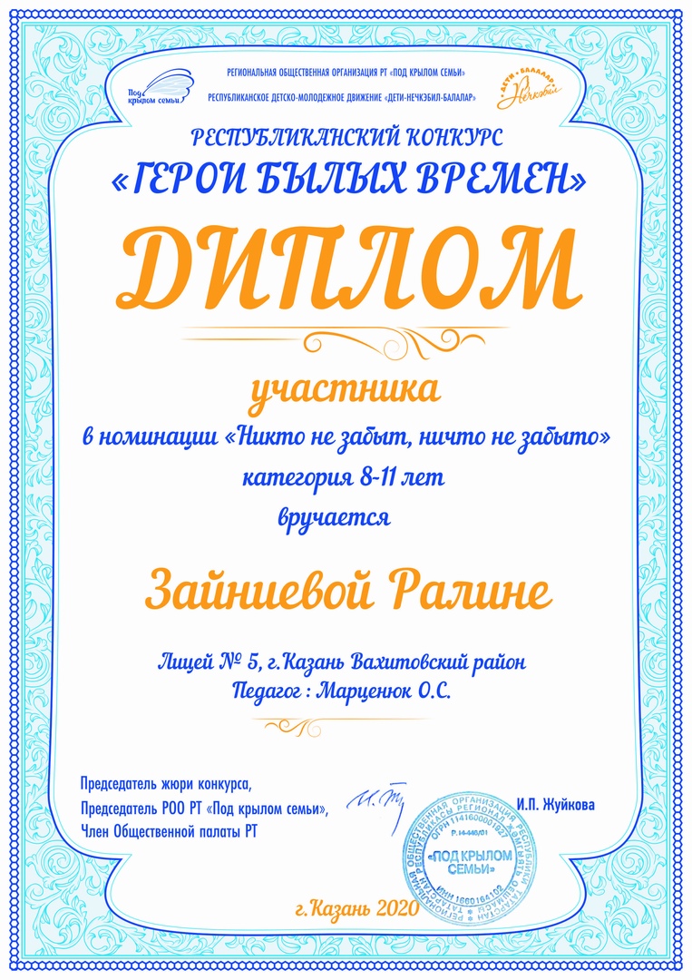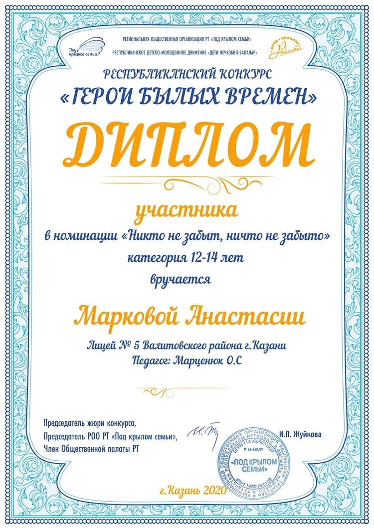 В середине февраля при поддержке Общественной палаты РТ и Министерства образования и науки РТ Региональная общественная организация «Под крылом семьи» объявила республиканский конкурс среди детей дошкольного и школьного возраста, приуроченный к 75-летию Великой Победы и 100-летию образования ТАССР. Конкурс проводился с целью повышения у детей и подростков духовно-нравственной культуры, патриотического воспитания на темы героизма и подвига, любви к своей Великой Родине и истории своего Отечества.