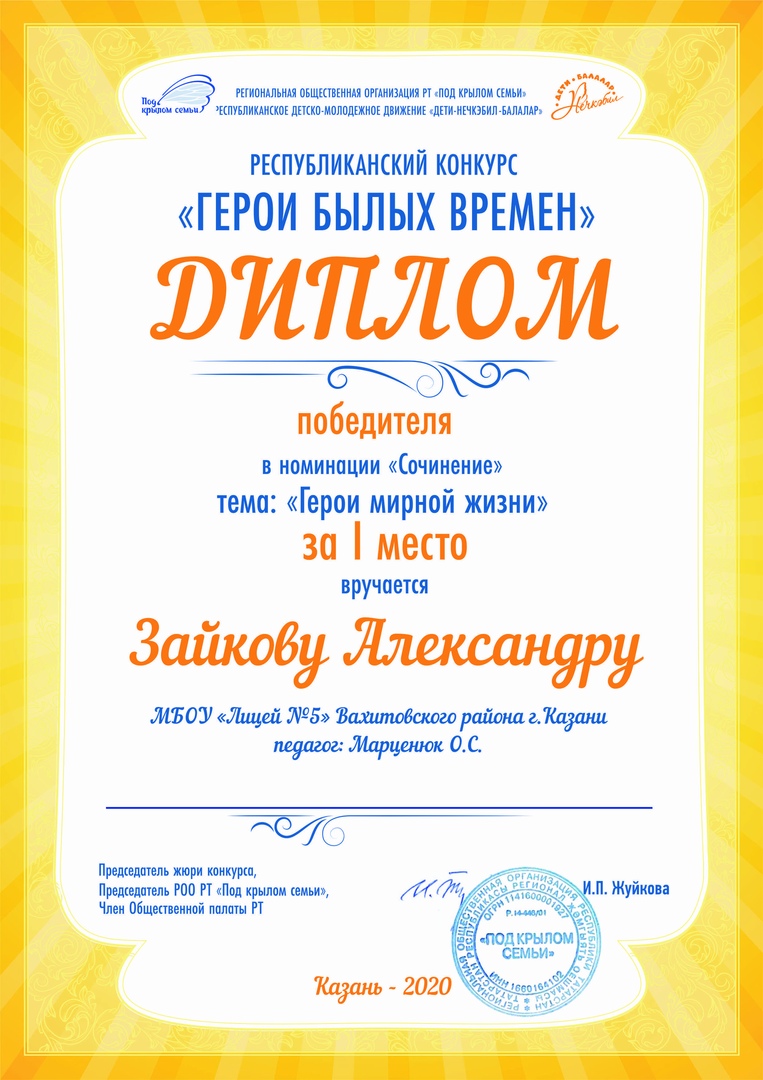 Поздравление победителей конкурса состоялось 1 июня на базе Общественной палаты Республики Татарстан в формате видеоконференции на платформе Zoom. Победителей номинации «Герои мирной жизни» поздравила член жюри конкурса, корреспондент газеты «Республика Татарстан», заслуженный работник культуры РТ, победитель конкурса «Хрустальное перо» Мушкина Ирина Владимировна.