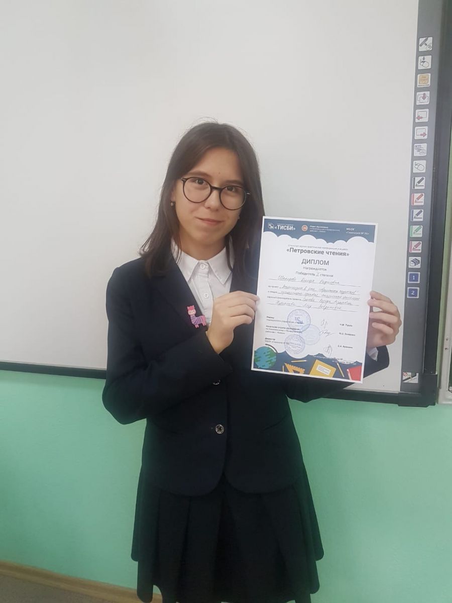22 марта 2019 года на базе МБОУ «Гимназии № 96» состоялась Открытая научно-практическая конференция учащихся «Петровские чтения» среди учащихся 3-11 классов. Ученица 3 «В» нашего лицея Асянова Инесса(учителя Ганеева Р.А и Закирова Г.Г) заняла 2 место в гуманитарно-языковой секции (Английская филология). Поздравляем Инессу с успешным выступлением на конференции и желаем ей вдохновения и покорения новых высот!