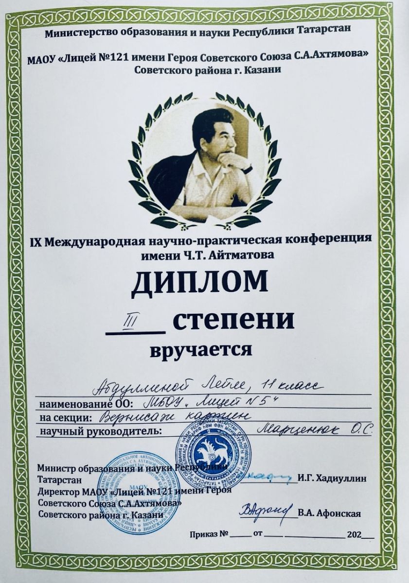 Наш лицей представили ученицы 6, 9 и 11 классов в номинациях «Чтение отрывков из произведений Ч. Айтматова и писателей(поэтов)- юбиляров» и «Вернисаж картин»: Хасамеева Аида (6А класс, руководитель Комиссарова А.А.) - диплом 2 степени, Зайниева Ралина (9В класс, руководитель Марценюк О.С.) – диплом 3 степени, Спиридонова Ксения (11А класс, руководитель Марценюк О.С.) – диплом 1 степени, Абдуллина Лейла (11А класс, руководитель Марценюк О.С.) - диплом 3 степени. Поздравляем! Желаем творческих успехов!