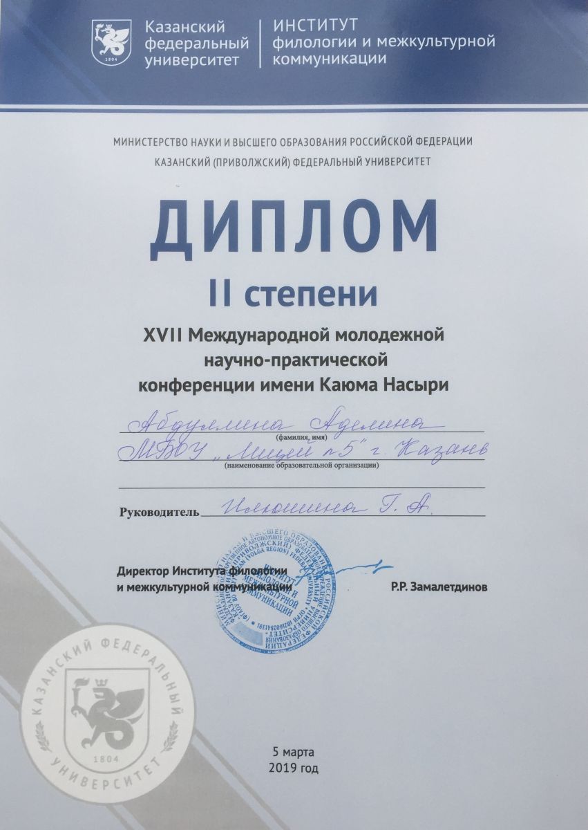 1. Маликов Булат, 10а класс – секция «Татарская филология» - диплом II степени( научный руководитель Шафеева Д.А.);