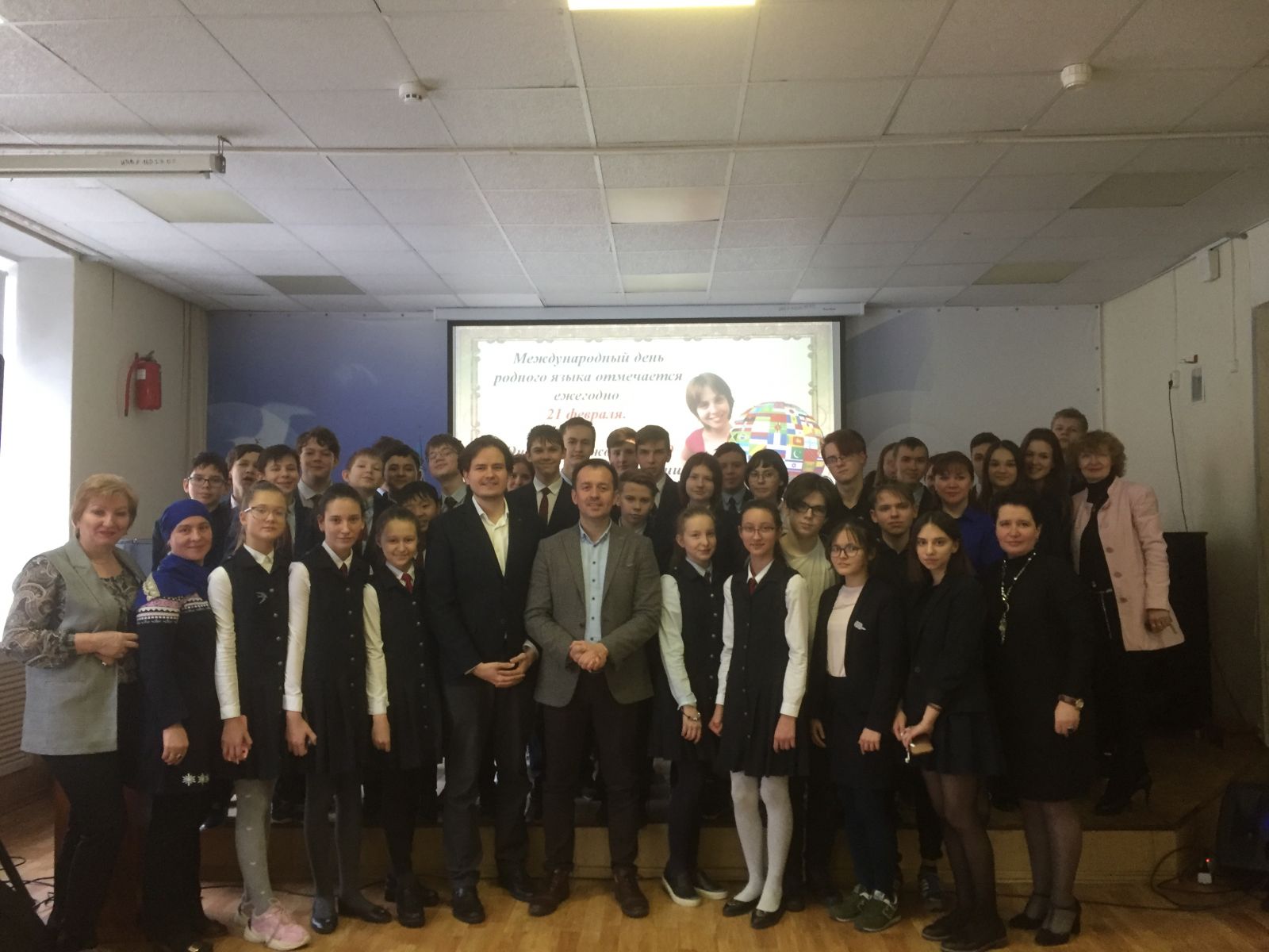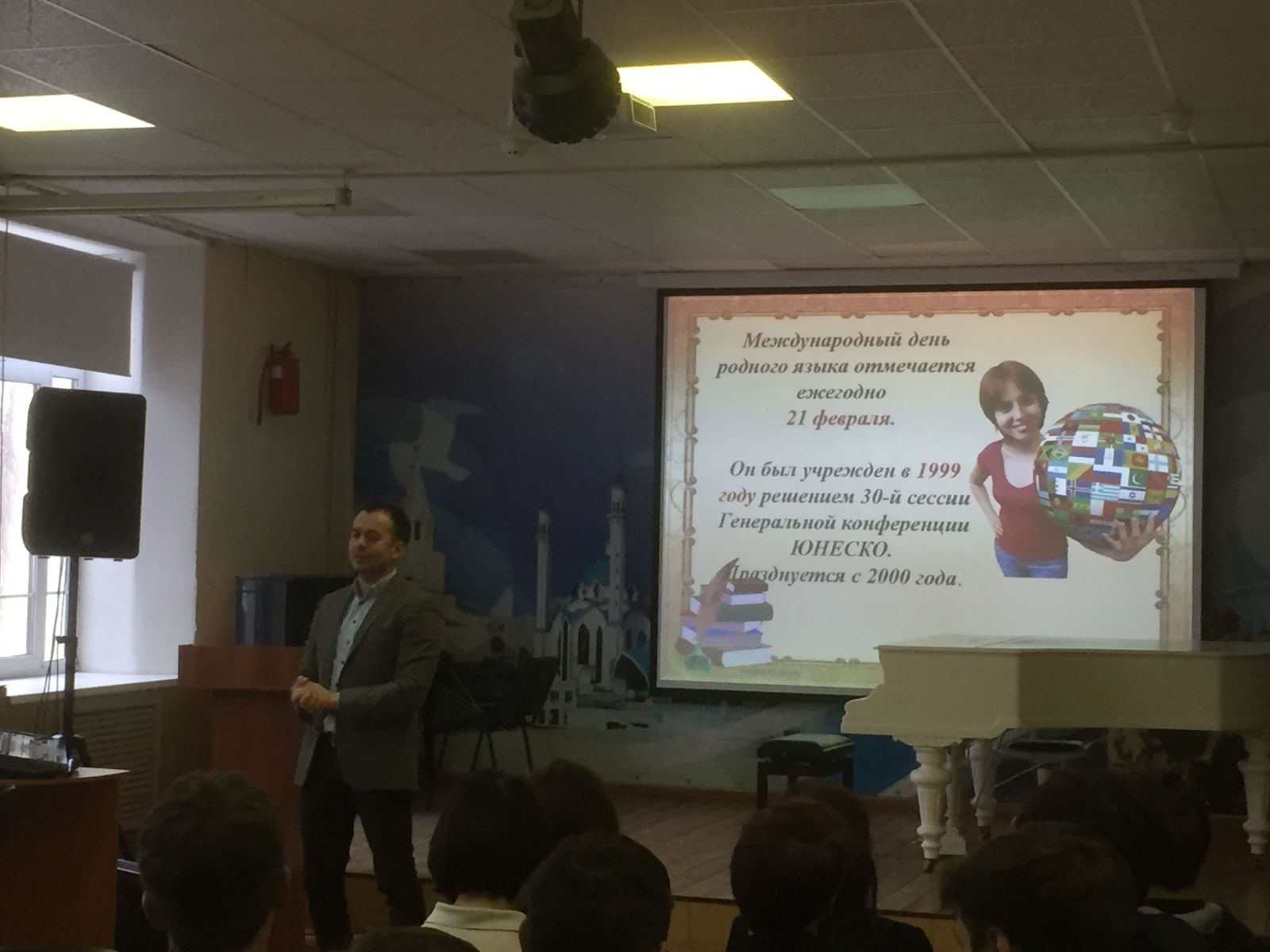 Международный день родного языка отмечается ежегодно 21 февраля. Он был утвержден в 1999 году решением 30-й сессии Генеральной конференции ЮНЕСКО. Празднуется с 2000 года. В связи с этим праздником, в МБОУ «Лицей №5» пригласили Cалавата Минниханова - певца татарской эстрады и Айдара Габдрахманова - кинорежиссера. Был проведен мастер класс на тему «Съемочный процесс. Взаимодействие режиссера, оператора и гафера». Гости рассказали ребятам какпроводятся съемки клипа, какие бывают проблемы и на что нужно обратить внимание при работе с камерой. Ребята были заинтересованы рассматриваемой темой, задавали свои вопросы. Мастер класс понравился детям.