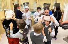 Ребятам была проведена обзорная экскурсия по Симуляционному центру, где они научились базовой сердечно-легочной реанимации, а также овладели навыками оказания первой медицинской помощи, познакомились с принципом работы аппарата УЗИ , и даже научились накладывать повязку «Чепец». -