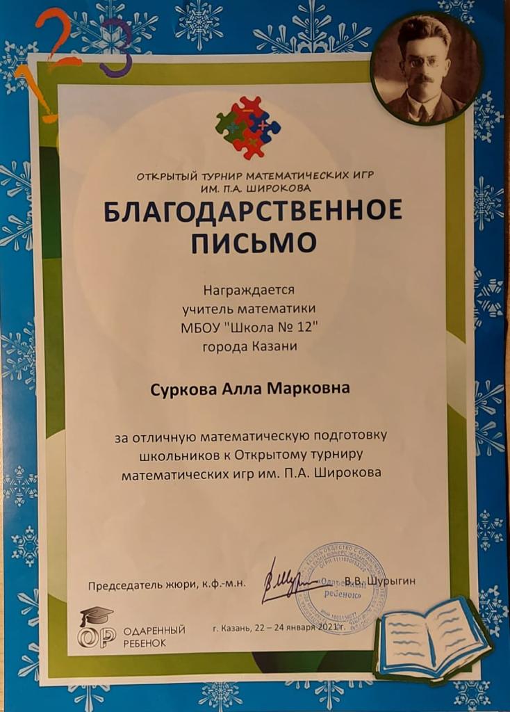 Поздравляем команду "ДЕдуКция" с призовыми местами в открытом турнире математических игр им. П. А. Широкова, а так же Суркову Аллу Марковну за подготовку команды. Желаем успехов и новых побед!