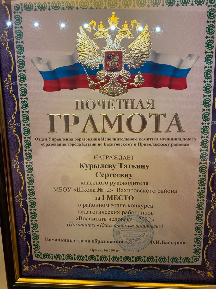 Опубликовано: 20.12.2021Сегодня, 20 декабря 2021 года в КЦ Чулпан были объявлены результаты районного этапа Всероссийского конкурса педагогических работников Воспитать человека. Курылева Татьяна Сергеевна достойно выступила и представила нашу школу и стала победителем , заняв 1 место в этом серьезном конкурсе. Первая ступень покорена. Идём дальше с верой в победу на следующих этапах. Мы от всей души поздравляем Татьяну Сергеевну с победой, верим в будущие достижения и желаем покорения новых высот.