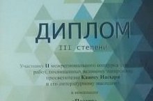 Поздравляем ученицу 8 класса Гулию и учителя татарского языка и литературы Рамиля Мударрисовича с дипломом III степени за участие во II межрегиональном конкурсе творческих работ, посвященных великому татарскому поэту - просветителю Каюму Насыри по его литературному наследию, в номинации "Поэзия" среди участников в возрастной группе 12-17 лет.