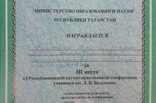 Җ.В.Вилькеев исемендәге 1нче республика фәнни конференциясендә, 10А сыйныфы укучысы Конькина Алиса физикадан уңышлы чыгыш ясап, 3нче дәрәҗә дипломга лаек булды. Уңышлар телибез.