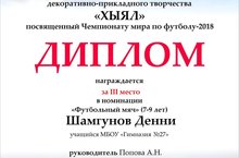 По итогам конкурса декоративно- прикладного творчества «Хыял» посвященного Чемпионату мира по футболу – 2018, наш ученик 1 б класса Шамгунов Денни занял 3 место и награжден Дипломом.