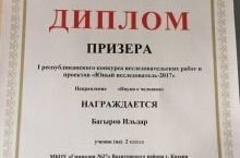 Ученик 2а класса Багыров Ильдар (руководитель Юсупова З.Р.) стал призером I республиканского конкурса исследовательских работ и проектов «Юный исследователь - 2017» в номинации «Наука о человеке».