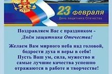 Уважаемые мужчины, поздравляем вас с Днем защитника Отечества! Желаем вам мирной жизни, без войн, потерь и трагедий. Пусть ваши силы растут, умения и навыки множатся, достижения превосходят все ожидания. Пусть окружающие радуют, семья дает силы и вдохновение, работа приносит желанные плоды. Мужества вам, силы духа и много удачи!