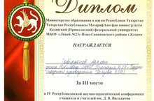 Гимназиябезнең 11 А сыйныфы укучысы Сабирҗанов Арслан физикадан IV Республика күләмендә үткәрелгән Җ.В. Вилькеев исемендәге фэнни-практик конференциядә үзе ижат иткэн техника моделе белән уңышлы чыгыш ясап, 3 нче дәрәҗә дипломга лаек булды. Арсланга алга таба да зур уңышлар телибез!