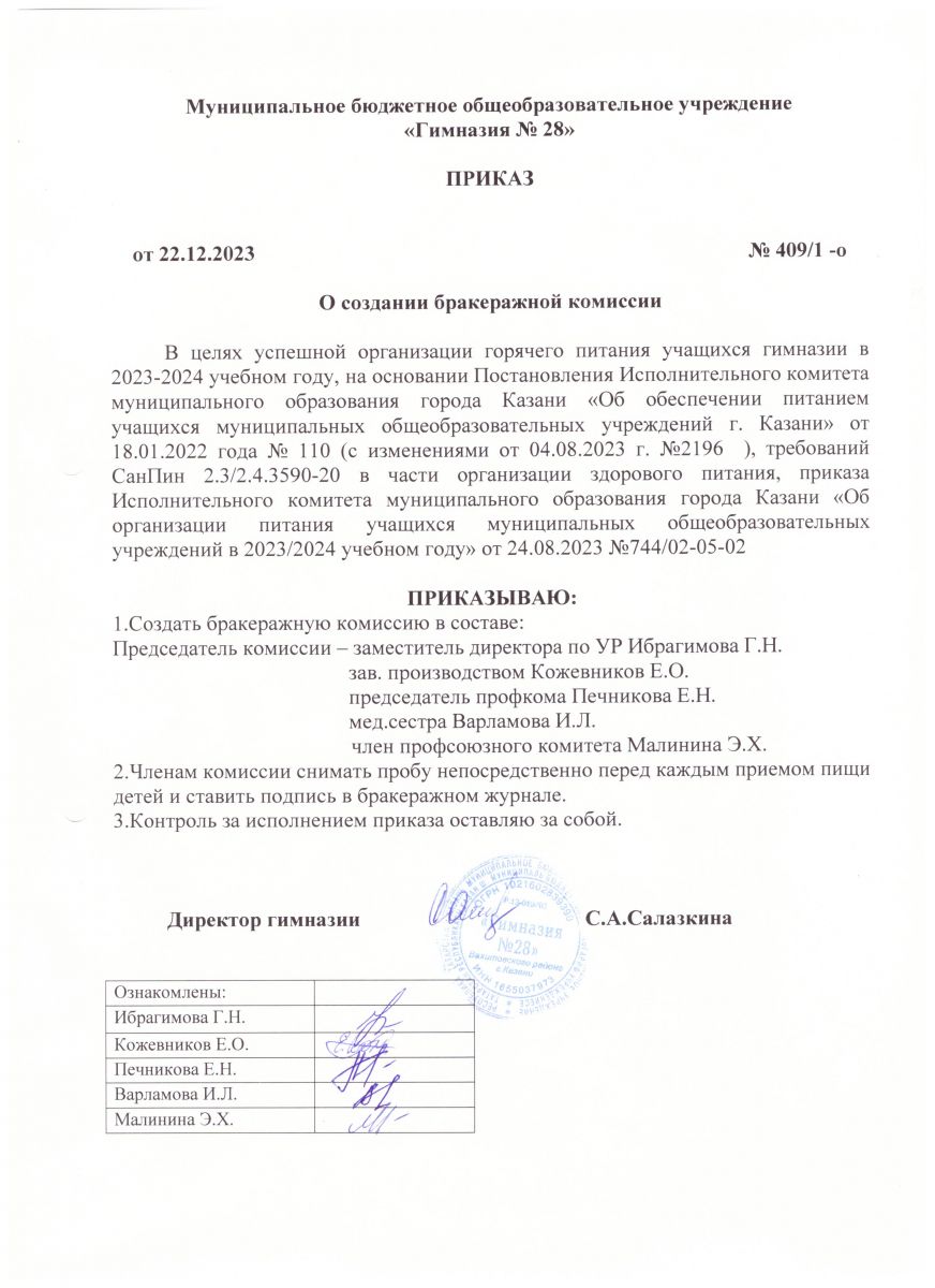 Приказ о создании бракеражной комиссии от 22.12.2023г.