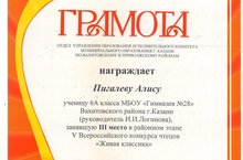 Поздравляем ученицу 6"А" класса Пигалеву Алису, занявшую 3 место в районном этапе V Всероссийского конкурса чтецов "Живая классика".