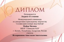 Поздравляем ученицу 6а класса Майер Милану с дипломом лауреата II степени! (Руководитель - Илларионова Анастасия Анатольевна). -