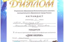 Поздравляем Ахметову Диану, ученицу 9а класса, победительницу в X-ой научно-практической городской конференции школьников в секции экология. Выражаем благодарность научному руководителю, учителю биологии Алсу Гумаровне. Желаем дальнейших успехов!