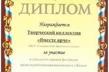 Творческий коллектив учителей гимназии "Вместе ярче" награжден Дипломом за отличное выступление в городском хоровом фестивале среди педагогических коллективов г.Казани. Спасибо.Молодцы!