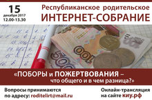 Министерство образования и науки РТ сообщает, что 15 декабря 2017 года в 12.00 состоится республиканское родительское интернет-собрание "Поборы и пожертвования: что общего и в чем разница?"