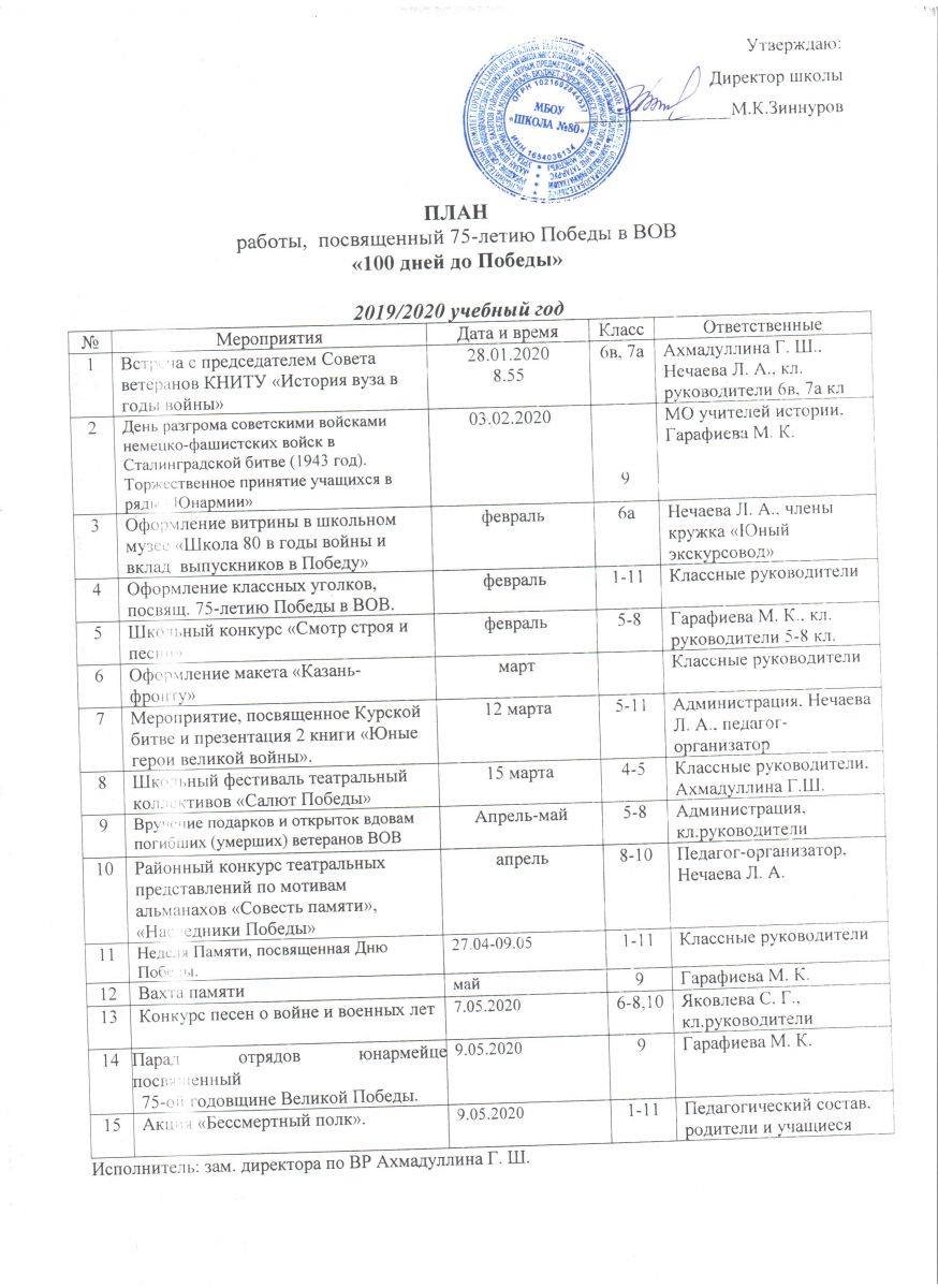 План работы школы, посвященный 75-летию Победы в ВОВ "Акция "100 дней до Победы"