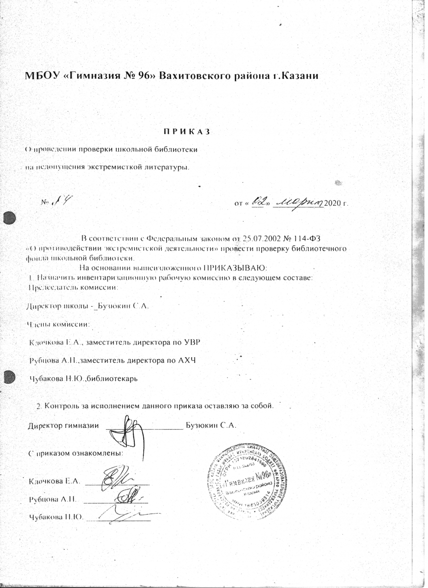 - Приказ о проведении проверки школьной библиотеки на недопущения экстремисткой литературы