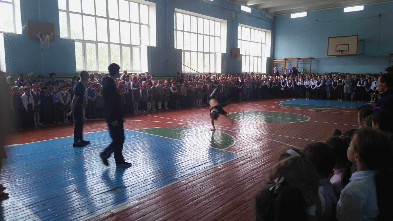 Опубликовано: 25.09.2018Традиционно каждый второй вторник в большом спортивном зале школы проходит общешкольная линейка для учащихся 1-11 классов. Обучающиеся школы получили свои заслуженные награды, по итогам различных конкурсов. Также на линейке, представители школы брейк-данса показали небольшой мастер-класс!