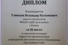 ГДДТ им. А.Алиша поздравляет Искандера Улюкаева с победой в городском конкурсе Управления образования г.Казани для педагогов-организаторов учреждений дополнительного образования «Органайзер УДО».