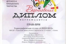 Образцовый коллектив РФ - хореографическая студия "Алишевец" ГДДТ им.А.Алиша стала обладателем Гран-при Всероссийского фестиваля-конкурса детского и юношеского творчества "Вдохновение", основным учредителем которой является ГБУДО "Республиканский центр внешкольной работы" (Региональный модульный центр). Педагоги студии получили Диплом "Лучший хореограф".