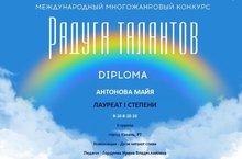 Поздравляем Антонову Майю, учащуюся театра эстрады, сатиры и юмора "ЕрашОК" (руководитель Ирина Владиславовна Гордеева) с победой в международном многожанровом конкурсе "Радуга талантов"!