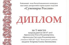 Подведены итоги районного этапа республиканского конкурса выставки декоративно-прикладных изделий "Сувениры России". Поздравляем Афанасьеву Ольгу и Афанасьеву Светлану, учащихся студии "Завиток" (руководитель Елена Евгеньевна Егорова), занявших 1 место в возрастной группе 16-17 лет и Рахими Марям и Мухамедзянову Алину, занявших 1 место в возрастной группе 11-13 лет. Поздравляем! Желаем дальнейших творческих побед!