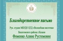 Союз художников Республики Татарстан благодарит руководителя студии "Волшебная кисточка" Фоменко Алину Рустемовну за высокий профессионализм, компетентность, преданность своему делу. За обеспечение роста и совершенствования нравственного и творческого потенциала у детей. И надеется на дальнейшее плодотворное сотрудничество! Поздравляем!