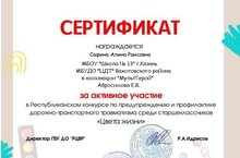 Поздравляем Сафину Алину, учащуюся студии "Мастерица" под руководством Абросимовой Е.В., за активное участие в республиканском конкурсе по предупреждению и профилактике дорожно-транспортного травматизма "Цвета жизни".