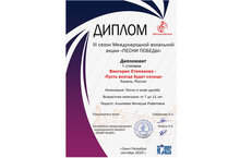 Поздравляем Викторию Степанову, учащуюся вокальной студии "Шатлык" (педагог Альмеева Миляуша Рифатовна) с получением диплома I степени III сезона международной вокальной акции "Песни Победы"!