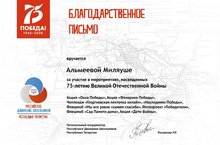 Руководитель вокальной студии "Шатлык" Альмеева Миляуша Рифатовна получила благодарственное письмо от общественной организации "Российское движение школьников" за активное участие в мероприятиях, посвященных 75-летию Победы в Великой Отечественной войне