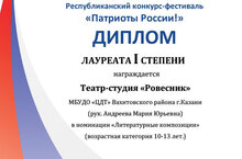 Подведены итоги республиканского конкурса-фестиваля "Патриоты России!", в котором приняли участие учащиеся театра-студии "Ровесник" (педагог Андреева Мария Юрьевна) и учащиеся театра "Арт" (педагог Хасанова Лия Ринатовна). Итоги конкурса: коллектив театра-студии "Ровесник" — лауреат I степени; Анисимов Мирон — лауреат I степени; Анисимова Кира — лауреат I степени; Маслова Вероника — лауреат III степени; Чубаева Диана — дипломант I степени. В театре "Арт" победителями стали: Балуева Азалия — лауреат II степени; Стрелков Лев — лауреат II степени; Чернявская Ирина — лауреат II степени; Садыкова Мира — лауреат III степени; Салахова Айгуль — дипломант I степени. Поздравляем победителей!!!
