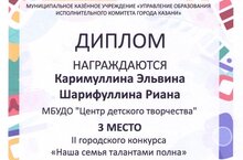 Поздравляем с победой во II городском конкурсе "Наша семья талантами полна": 3 место в номинации "Лоскутное творчество" - Каримуллина Эльвина и Шарифуллина Риана - учащиеся студии "Территория творчества" (руководитель Фалзянова Л.Г.); 2 место в номинации "Художественная обработка дерева" - Саушина Полина - учащаяся студии "Мастерица" (руководитель Ионова Е.В.); 2 место в номинации "Бумагопластика" - коллектив 4 "В" класса лицея № 116 - учащиеся объединения "Аппликация" (руководитель Байрамова Г.Г.). Молодцы! Желаем дальнейших творческих успехов!