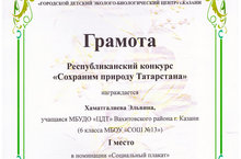 Поздравляем Хаматгалиеву Эльвину, учащуюся студии "Мастерица" под руководством Абросимовой Е.В. с победой в Республиканском конкурсе "Сохраним природу Татарстана". Эльвина заняла 1 место в номинации "Социальный плакат". Молодец!