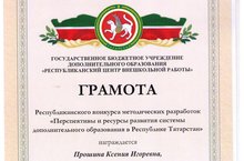 Прошина Ксения Игоревна награждена грамотой за вклад в развитие декоративно-прикладного творчества в Республиканском конкурсе методических разработок "Перспективы и ресурсы развития системы дополнительного образования в Республике Татарстан". Молодец! Желаем дальнейших творческих побед!