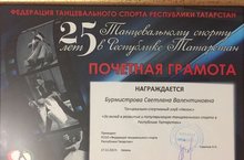 Почетной грамотой Федерации танцевального спорта РТ награждена педагог объединения "Спортивные бальные танца" Бурмистрова С.В. за вклад в развитие и популяризацию танцевального спорта в РТ. Грамота была вручена на торжественном мероприятии, посвященном 25-летию танцевальному спорту в РТ. Поздравляем!!!!
