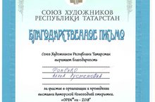 Союз Художников Республики Татарстан выражает благодарность педагогу студии «Волшебная кисточка» Фоменко Алине Рустемовне за участие в организации и проведении выставки Авторской Новогодней открытки «OPEN*ки-2018». Поздравляем!!!