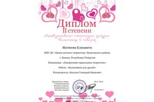 Поздравляем Матвееву Елизавету, обучающуюся студии "Эврика" (педагог Киселев Г.И.) с победой в Международном творческом конкурсе "Валентинка в подарок". Лиза получила Диплом II степени. Поздравляем! Молодцы!