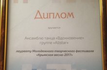 Поздравляем ансамбль танца «Вдохновение» (группа «All stars»), педагоги Гареева Д.Ф., Суханова Ж.П.) c Дипломом лауреата Молодежного творческого фестиваля «Крымская весна – 2017», который состоялся 18 марта 2017 года в Национальном культурном центре «Казань»!