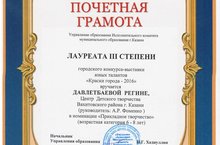 Поздравляем Давлетбавеву Регину с победой в городском конкурсе-выставке юных талантов «Краски города - 2016».